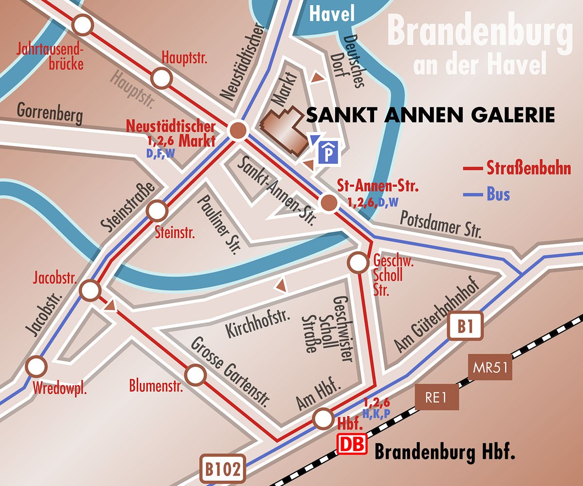 You can reach the Sankt Annen Galerie with the bus lines D, F, G, B and W and the tram lines 1, 2 and 6 of the VBBR at the "Neustädtischer Markt" tram/bus stop. For further information regarding the public transportation system in Brandenburg, please consult the following website: Verkehrsbetriebe Brandenburg an der Havel GmbH (VBBR).